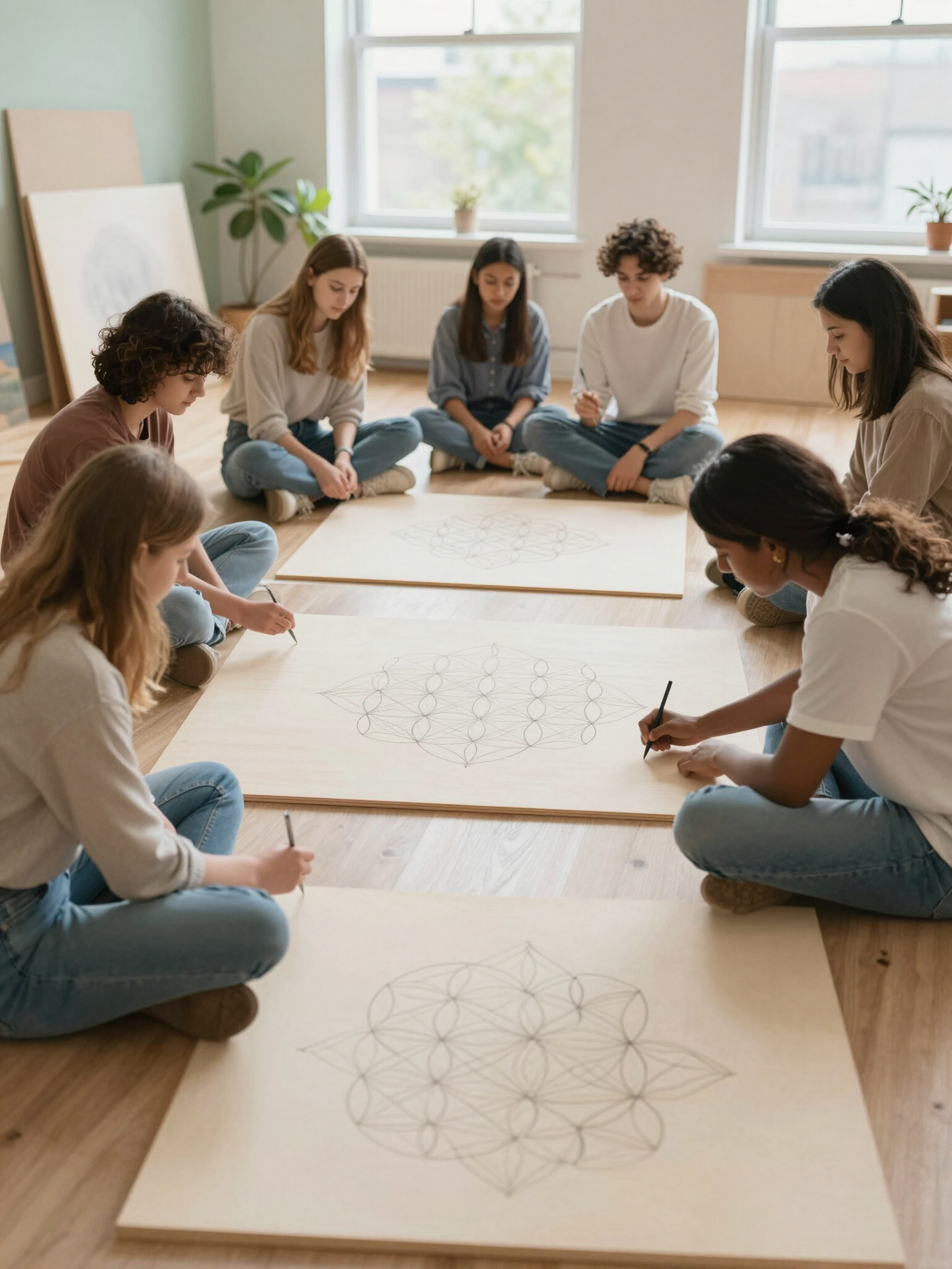 Plongez au cœur de nos espaces d’apprentissage où la géométrie sacrée rencontre la créativité. Nos étudiants explorent l’harmonie universelle à travers des ateliers pratiques, cultivant sagesse et équilibre intérieur.